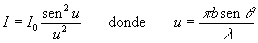 Difracción de micropartículasConsideremos un frente de onda plano que llega a una rendija estrecha. Supongamos que la pantalla está lo suficientemente alejada en comparación con la anchura de la rendija. Se observa sobre la pantalla un conjunto de franjas claras y oscuras que corresponden a los máximos y mínimos de la difracción de la luz por la rendija. A esta situación se la denomina difracción Fraunhofer. Las posiciones de los mínimos están dados por la ecuación b senq =nl donde l es la longitud de onda, b la anchura de la rendija y n un número entero. El valor de n=0 corresponde al máximo central. La intensidad viene dada por la expresión dicha función tiene un máximo para u=0, y ceros o mínimos para u=np
