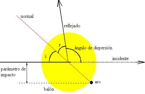 Se denomina parámetro de impacto b, a la distancia entre la dirección de la velocidad del centro del disco y el obstáculo puntual. Si el parámetro de impacto b, es mayor o igual que el radio del disco R, no se dispersa continuando con la dirección incidente original. Ahora bien, si el parámetro de impacto es menor que el radio del disco, suponiendo un choque elástico con un obstáculo fijo, el disco se refleja siguiendo una dirección que forma un ángulo suplementario a la suma del ángulo de incidencia i y reflejado r. Del mismo modo que en una reflexión especular, el ángulo de incidencia es igual al ángulo de reflexión, i=r. La normal en este caso es la recta que une el obstáculo puntual y el centro del disco. El ángulo de dispersión, como puede fácilmente deducirse de la figura, es