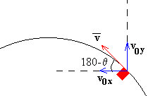 La partícula deja de tener contacto con el bucle en el instante en el que la fuerza normal es cero, N=0. Por lo que En dicho instante, la partícula se mueve bajo la única fuerza de su propio peso describiendo un movimiento curvilíneo bajo la aceleración constante de la gravedad o un tiro parabólico. Situamos los ejes en el centro del bucle. La posición de lanzamiento, tal como se ve en la figura anterior, es x0=R·sen(180-q )