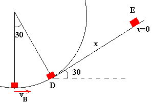 Examinamos las distintas situaciones que se producen cuando se comprime el muelle x. Ejemplo 1 Se comprime el muelle x=0.24 cuando se actúa con el puntero del ratón sobre el pequeño cuadrado de color rojo, que representa una partícula de masa m=1 kg. La velocidad con la que llega al punto B, inicio de la pista circular es La partícula pasa por el punto mas alto C de la pista circular con una velocidad de Regresa al punto B, parte inferior de la pista circular con la misma velocidad vB=5.01 m/s o una velocidad angular de ω=10.02 rad/s. Llega al punto D comienzo de la pista inclinada 30º con una velocidad Calculamos el máximo desplazamiento D de la partícula a lo largo del plano inclinado Ejemplo 2 Se comprime ahora el muelle x=0.2 m La velocidad con la que llega al punto B, inicio de la pista circular es La partícula desliza por la pista circular hasta que la velocidad sea cero o la reacción N se hace cero. En este caso, se analiza la segunda situación Su velocidad v en esta posición es La partícula describe una parábola hasta que choca con la parte inferior de la pista circular. Ejemplo 3 Se comprime ahora el muelle x=0.1 m La velocidad con la que llega al punto B, inicio de la pista circular es La partícula desliza por la pista circular hasta que la velocidad sea cero Retrocede pasando por B, parte inferior de la pista circular con la misma velocidad ya que no hay rozamiento, desliza por la pista horizontal, y puede llegar a A o puede pararse antes. La partícula no llega a la posición A, se para a la distancia Se para a una distancia de 47 cm medido desde B o de 70-47=23 cm medido desde el origen A.
