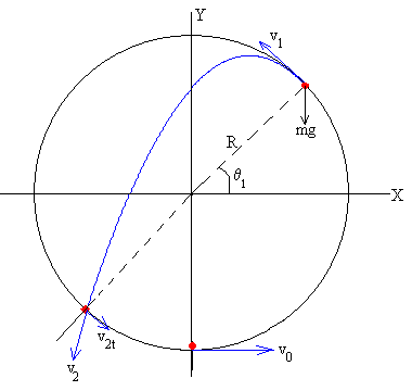 Para analizar este movimiento complejo, situamos el origen en el centro del bucle y medimos los ángulos desde el eje X. El nivel cero de energía potencial lo situamos en el eje X. En la posición angular θ1 la partícula deja de tener contacto con el bucle, la reacción N es nula La ecuación de la dinámica del movimiento circular y el principio de conservación de la energía se escriben Combinando ambas ecuaciones determinamos el valor del ángulo θ1 Una vez que llega P1 describe un movimiento parabólico, la velocidad y la posición de la partícula es Choca con el bucle en el punto P2 que es el punto de intersección entre la parábola y la circunferencia de radio R. Recordando que la ecuación de una circunferencia, cuando su centro está en el origen de coordenadas es x2+y2=R2 Teniendo en cuenta que de la dinámica del movimiento circular Llegamos a la siguiente expresión simplificada El tiempo de vuelo de la partícula hasta que choca con el bucle es La posición del punto de impacto P2 y la velocidad de la partícula son, respectivamente Después del choque, supondremos que se anula la componente normal de la velocidad, y la partícula desliza sobre el bucle con la componente tangencial de la velocidad. La componente normal de la velocidad se calcula mediante el producto escalar r2·v2 El módulo del vector posición r2 del punto P2 es el radio R de la circunferencia La energía final de la partícula en el punto de impacto P2 es La energía en el punto de impacto es menor que la energía de la partícula en el punto de lanzamiento En la figura se muestran, las trayectorias parabólicas seguidas por la partícula, para distintos valores de la velocidad inicial v0 en la parte inferior del bucle.