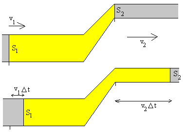 Ecuación de la continuidadConsideremos una porción de fluido en color amarillo en la figura, el instante inicial t y en el instante t+Dt. En un intervalo de tiempo Dt la sección S1 que limita a la porción de fluido en la tubería inferior se mueve hacia la derecha Dx1=v1Dt. La masa de fluido desplazada hacia la derecha es Dm1=r·S1Dx1=rS1v1Dt. Análogamente, la sección S2 que limita a la porción de fluido considerada en la tubería superior se mueve hacia la derecha Dx2=v2Dt. en el intervalo de tiempo Dt. La masa de fluido desplazada es Dm2=r S2v2 Dt. Debido a que el flujo es estacionario la masa que atraviesa la sección S1 en el tiempo Dt, tiene que ser igual a la masa que atraviesa la sección S2 en el mismo intervalo de tiempo. Luego