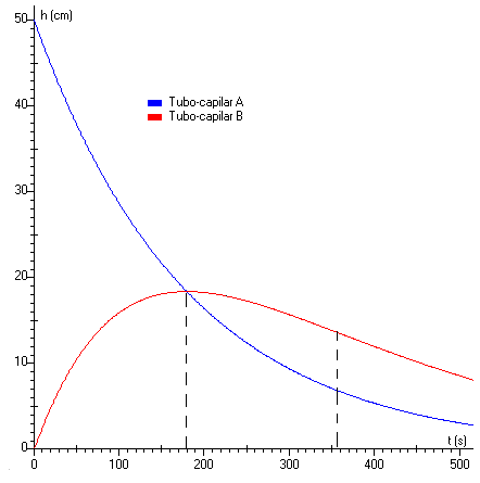 Podemos observar que el tubo A disminuye su altura x exponencialmente, y el tubo C por ser cerrado incrementa siempre su altura. Sin embargo, es más importante el comportamiento del tubo-capilar intermedio B: primero crece la altura de su columna de fluido hasta llegar a un máximo y luego, decrece hasta hacerse cero (en un tiempo teóricamente infinito). Observamos tres fases en el comportamiento del tubo-capilar B: