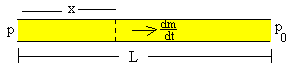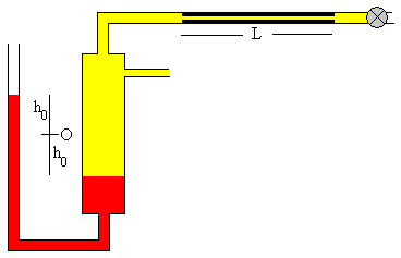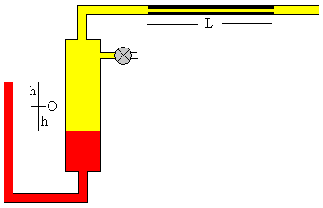 La ley de Poiseuille se escribe El signo menos aparece por que la presión p del gas disminuye a medida que sale por el tubo capilar Integramos esta ecuación teniendo en cuenta que dm/dt es constante a lo largo del tubo capilar. La presión en el extremo x=0 del tubo capilar es p y la presión en el otro extremo x=L es p0 (atmosférica). El dispositivo experimentalEn la figura, se muestra la situación inicial del dispositivo. El manómetro de mercurio a la izquierda, el volumen V0 de la región comprendida entre el mercurio y el tubo capilar, el tubo capilar de longitud L y radio r. El gas cuya viscosidad se va a medir, se introduce en la región comprendida entre el mercurio del manómetro y el capilar, hasta alcanzar la presión p deseada.