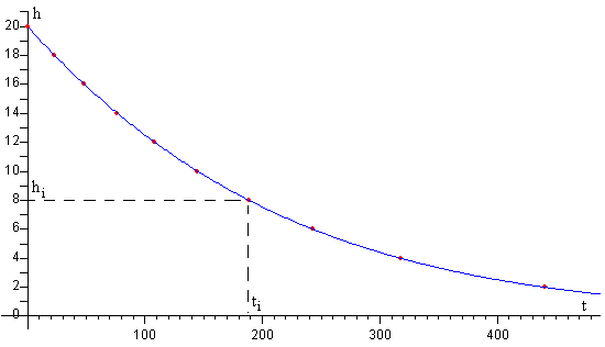 Cuando se alcanza la presión deseada, se abre la llave situada en el extremo del capilar, el gas fluye a través del mismo impulsado por la diferencia de presión p-p0, la diferencia de alturas 2h de los niveles de mercurio en las dos ramas del manómetro va disminuyendo. En el instante t la diferencia de alturas de los niveles de mercurio en las dos ramas del manómetro es 2h. La presión p y el volumen V del gas contenido en el recipiente, va cambiando con el tiempo. La masa m de gas contenido en el recipiente, disminuye. La masa que atraviesa la sección normal del capilar en la unidad de tiempo es, aplicando la ley de los gases ideales Aplicando la ley de Poiseuille al movimiento de un gas a través de un capilar Para integrar expresamos el volumen V del gas y su presión p en función de la variable h. p=p0+2ρgh dp=2ρg·dh p0= ρgH, es la presión atmosférica. H=76 cm altura de la columna de mercurio La diferencia ente los niveles de mercurio en las dos ramas del manómetro es 2h0 en el instante t=0. Al cabo de un cierto tiempo t, ha salido una cierta cantidad de gas por el tubo-capilar y la presión ha disminuido, la diferencia entre los niveles de mercurio en las dos ramas del manómetro es 2h. Manteniendo fijos h0 y h en las medidas que se realizan con los gases disponibles, vemos que el tiempo t es proporcional a la viscosidad η, la constante de proporcionalidad K se denomina constante del aparato. Se determina, habitualmente, a partir del dato de la viscosidad conocida de un gas (por ejemplo, el aire). Como la diferencia de alturas 2h ente los niveles de mercurio en las dos ramas del manómetro, es una función implícita del tiempo t. En la simulación, se calcula el tiempo ti que corresponde a n valores de la altura hi comprendidas entre h0 y 0 (excluido h=0). A partir de estos pares de datos, se calcula una función de interpolación para cualquier valor de t empleando el procedimiento denominado polinomio de Lagrange, tal como se aprecia en la figura. Actividades