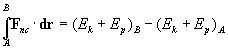 Dada la energía potencial podemos obtener la fuerza conservativa, derivando La energía potencial asociada con las dos fuerzas conservativas es Ep=(mg- rfVg)y A medida que el globo asciende en el aire con velocidad constante experimenta una fuerza de rozamiento Fr debida a la resistencia del aire. La resultante de las fuerzas que actúan sobre el globo debe ser cero. rf Vg- mg-Fr=0 Como rfVg> mg a medida que el globo asciende su energía potencial Ep disminuye. Empleando el balance de energía obtenemos la misma conclusión El trabajo de las fuerzas no conservativas Fnc modifica la energía total (cinética más potencial) de la partícula. Como el trabajo de la fuerza de rozamiento es negativo y la energía cinética Ek no cambia (velocidad constante), concluimos que la energía potencial final EpB es menor que la energía potencia inicial EpA. En la página titulada "movimiento de un cuerpo en el seno de un fluido ideal", estudiaremos la dinámica del cuerpo y aplicaremos el principio de conservación de la energía.
