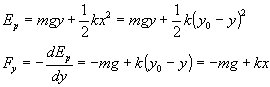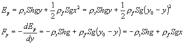 Cuando el cuerpo está parcialmente sumergido, sobre el cuerpo actúan dos fuerzas el peso mg=rsSh·g que es constante y el empuje rfSx·g que no es constante. Su resultante es F=(-rsShg+rfSxg)j. Donde S el área de la base del bloque, h la altura del bloque y x la parte del bloque que está sumergida en el fluido. Tenemos una situación análoga a la de un cuerpo que se coloca sobre un muelle elástico en posición vertical. La energía potencial gravitatoria mgy del cuerpo disminuye, la energía potencial elástica del muelle kx2/2 aumenta, la suma de ambas alcanza un mínimo en la posición de equilibrio, cuando se cumple mg+kx=0, cuando el peso se iguala a la fuerza que ejerce el muelle. El mínimo de Ep se obtiene cuando la derivada de Ep respecto de y es cero, es decir en la posición de equilibrio. La energía potencial del cuerpo parcialmente sumergido será, de forma análoga El mínimo de Ep se obtiene cuando la derivada de Ep respecto de y es cero, es decir, en la posición de equilibrio, cuando el peso se iguale al empuje. -rsShg+rfSxg=0 El bloque permanece sumergido una longitud x. En esta fórmula, se ha designado r como la densidad relativa del sólido (respecto del fluido) es decir, la densidad del sólido tomando la densidad del fluido como la unidad. Fuerzas sobre el bloque