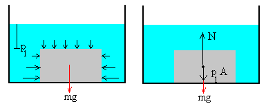 p2·A o bien, mg=ρfh·Ag Como la presión en la cara inferior del cuerpo p2 es mayor que la presión en la cara superior p1, la diferencia es ρfgh. El resultado es una fuerza hacia arriba ρfgh·A sobre el cuerpo debida al fluido que le rodea. Como vemos, la fuerza de empuje tiene su origen en la diferencia de presión entre la parte superior y la parte inferior del cuerpo sumergido en el fluido. Con esta explicación surge un problema interesante y debatido. Supongamos que un cuerpo de base plana (cilíndrico o en forma de paralepípedo) cuya densidad es mayor que la del fluido, descansa en el fondo del recipiente. Si no hay fluido entre el cuerpo y el fondo del recipiente ¿desaparece la fuerza de empuje?, tal como se muestra en la figura Si se llena un recipiente con agua y se coloca un cuerpo en el fondo, el cuerpo quedaría en reposo sujeto por su propio peso mg y la fuerza p1A que ejerce la columna de fluido situada por encima del cuerpo, incluso si la densidad del cuerpo fuese menor que la del fluido. La experiencia demuestra que el cuerpo flota y llega a la superficie. El principio de Arquímedes sigue siendo aplicable en todos los casos y se enuncia en muchos textos de Física del siguiente modo:
