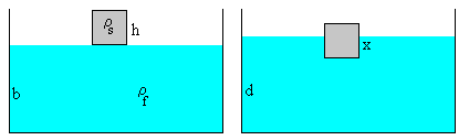 Supongamos un cuerpo en forma de paralepípedo de altura h, sección A y de densidad ρs. El fluido está contenido en un recipiente de sección S hasta una altura b. La densidad del fluido es ρf> ρs. Se libera el cuerpo, oscila hacia arriba y hacia abajo, hasta que alcanza el equilibrio flotando sobre el líquido sumergido una longitud x. El líquido del recipiente asciende hasta una altura d. Como la cantidad de líquido no ha variado S·b=S·d-A·x Hay que calcular x, de modo que la energía potencial del sistema formado por el cuerpo y el fluido sea mínima. Tomamos el fondo del recipiente como nivel de referencia de la energía potencial. El centro de masa del cuerpo se encuentra a una altura d-x+h/2. Su energía potencial es Es=(ρs·A·h)g(d-x+h/2) Para calcular el centro de masas del fluido, consideramos el fluido como una figura sólida de sección S y altura d a la que le falta una porción de sección A y altura x.