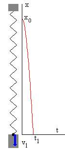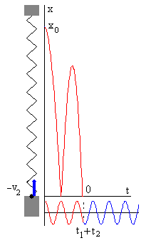 Se determinan los valores de las constantes A, B, C y D de la ecuación de la posición x en función del tiempo t para describir el movimiento de la partícula tras el primer rebote. En la parte superior de la figura, se muestra la posición de la partícula en función del tiempo, hasta el primer rebote. En la parte inferior, la gráfica de la fuerza oscilante f=F·cos(ωf·t+δ).En el instante t=t1 en el que se produce el primer rebote, la fase de la fuerza oscilante, se muestra en color rojo. Segundo rebote