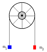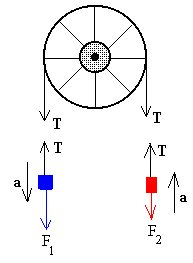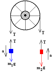 La máquina de AtwoodEn la figura, se muestran las fuerzas sobre cada uno de los dos cuerpos, supondremos que m1>m2. Consideramos que la aceleración de la gravedad g es constante en módulo y dirección