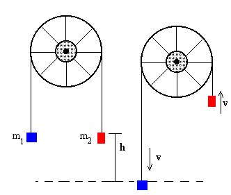 Aplicando el principio de conservación de la energía, se llega al mismo resultado. Comparamos el estado inicial y el estado final cuando el cuerpo de masa m1 desciende una altura h, y el cuerpo de masa m2 asciende la misma altura. Ponemos el nivel cero de energía potencial en la posición inicial de los dos cuerpos. Igualamos la energía inicial y la energía final.