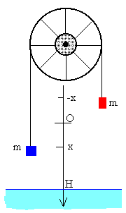 EjemploLa posición de equilibrio de los dos cuerpos a la misma altura H=100 m. Se desplaza los dos cuerpos x0=10 m. Calcular el tiempo que emplea en llegar al suelo y la velocidad final de los bloques. Datos: