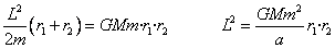 Eliminado v1 y v2 en este par de ecuaciones tenemos De la geometría de la elipse tenemos que r1=a+c siendo c la semidistancia focal. La relación entre los semiejes mayor a y menor b de la elipse es a2-b2=c2. Por lo que el producto r1·r2=b2 El módulo del momento angular L se expresa en términos de los semiejes a y b de la elipse Introduciendo el valor de L en la fórmula del periodo P obtenemos la tercera ley de Kepler. |