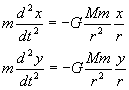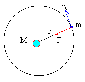 Solución numérica de las ecuaciones del movimientoSupongamos que una partícula de masa m (un planeta) es atraída por un cuerpo masivo de masa M (el Sol) Supondremos que la la influencia de la partícula sobre el cuerpo es despreciable permaneciendo en reposo en el origen. La partícula está sometida a una fuerza atractiva F cuya dirección es radial y apuntando hacia el centro del Sol. El módulo de la fuerza viene dado por la ley de la Gravitación Universal