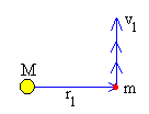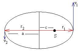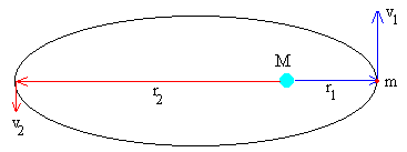 Fuerza central y conservativaEn la figura, se muestra un cuerpo que describe una trayectoria elíptica alrededor del centro de fuerzas situado en uno de sus focos. La distancia de máximo acercamiento es r1 y la de máximo alejamiento r2. Las velocidades que lleva el cuerpo en estas dos posiciones extremas son v1 y v2 respectivamente. La constancia del momento angular y de la energía nos permite relacionar estas cuatro magnitudes. Se pueden plantear dos problemas :