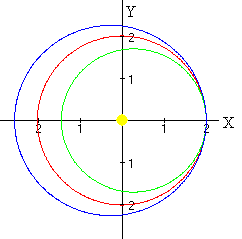 Se pulsa el botón titulado Empieza, Se traza la trayectoria del móvil, al mismo tiempo se muestra en la parte izquierda del applet, como van cambiando los valores de la posición y velocidad a medida que transcurre el tiempo. Observaremos que la energía y el momento angular permanecen constantes. En la parte inferior izquierda, se muestra en color azul el tanto por ciento de error. Cuando es mayor que la unidad el programa interactivo se detiene. Como podemos comprobar, los mayores porcentajes de error se obtienen cuando la partícula pasa muy cerca del centro fijo de fuerzas. Se pulsa el botón titulado Pausa, para parar el movimiento, por ejemplo, cuando el planeta pasa por la posición más próxima o más alejada, para medir el semieje mayor, la velocidad en dicha posición, y el semiperiodo (la mitad del tiempo que tarda el cuerpo celeste en dar una vuelta completa). Se pulsa el mismo botón que ahora se titula Continua, para reanudar el movimiento.. Se pulsa varias veces en el botón Paso, para mover el cuerpo paso a paso, se usa para acercarnos a la posición deseada. Cuando se ha completado una órbita se introduce la velocidad inicial en UA/año de un nuevo cuerpo sin cambiar la posición, y se pulsa el botón Empieza. Su trayectoria se traza en un color distinto. Finalmente, se cambia la posición inicial x y se vuelven a introducir varios valores de la velocidad vy. Cuando se han acumulado varias trayectorias, se pulsa en el botón Borrar para limpiar el área de trabajo del applet Ejercicio: Introduciendo la posición inicial del móvil Rp y la velocidad inicial Vp, se traza las sucesivas posiciones del planeta a intervalos fijos de tiempo. Pulsando en los botones Pausa y Paso, se tomarán los siguientes datos y se completará una tabla como la siguiente.