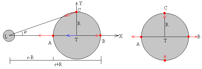 El origen de las fuerzas de mareaEl origen de las fuerza de marea se debe a que la Tierra es un cuerpo extenso y el campo gravitatorio producido por la Luna o por el Sol no es homogéneo en todos sus puntos, ya que hay unos puntos que están más cercanos y otros más alejados de dichos cuerpos celestes. Supondremos que la Tierra es un cuerpo rígido de forma esférica de radio R, que está cubierta por una capa de agua de espesor uniforme y de pequeña profundidad. El cuerpo perturbador, la Luna o el Sol se supone que está en el plano ecuatorial de la Tierra Aunque el Sol y la Luna se mueven, se considera que el agua está en todo momento en equilibrio, la velocidad y la aceleración de cualquier elemento de líquido respecto de la Tierra se supone despreciable. Supondremos inicialmente, que el cuerpo perturbador es la Luna, las mismas fórmulas serán aplicables para el Sol. Finalmente, analizaremos el efecto combinado de la Luna y del Sol. Consideremos la Tierra y la Luna inmóviles en el espacio estando sus centros separados una distancia r. La fuerza de marea, en una determinada posición P de la superficie de la Tierra, es igual a la diferencia entre la fuerza de atracción que la Luna ejerce sobre un objeto situado en dicha posición, y la fuerza de atracción que ejercería sobre tal objeto si estuviese en el centro de la Tierra. Dibujamos las fuerzas de atracción que ejerce la Luna (en color rojo) sobre un objeto de masa m situado en los puntos A, B y C, y la fuerza que ejercería (en color azul) sobre dicho objeto si estuviese situado en el centro T de la Tierra. A la derecha, se dibujan las fuerzas de marea (diferencia entre los vectores rojos y azul) en los puntos A, B y C. En el centro de la Tierra T, la fuerza de atracción está dirigida hacia el centro de la Luna