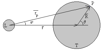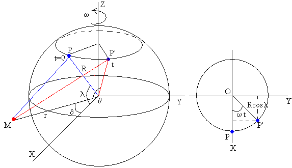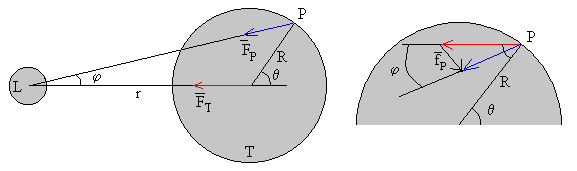 Componentes de la fuerza de marea.Para calcular la componente radial de la fuerza de marea, hacemos el producto escalar fP·R=fR·R, donde fR es la componente radial de la fuerza de marea La componente tangencial ft se calcula mediante el módulo del producto vectorial |fPxR|=ft·R