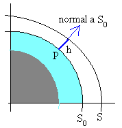 Elevación de la capa de aguaEl siguiente paso, cuya demostración se omite, por razones de dificultad matemática, pero que puede consultarse en el primer artículo citado en las referencias, es el cálculo de la energía potencial correspondiente a la fuerza de marea fP. La forma S0 de la superficie debido a la fuerza de atracción de la Tierra y a su rotación es la de un esferoide de revolución alrededor del eje polar. La fuerza centrípeta, debida a la rotación de la Tierra alrededor de su eje, que es una fuerza independiente del tiempo, no añade nada a las fuerzas de marea.