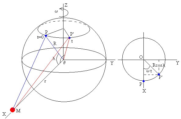 Teniendo en cuenta, que el volumen de agua que cubre la Tierra permanece constante, se determina la elevación h del punto P de la superficie S0 debida exclusivamente a las fuerzas de atracción del cuerpo perturbador. donde M es la masa del cuerpo perturbador, MT=5.98·1024 kg es la masa de la Tierra, R su radio, r la distancia entre el centro de la Tierra y el centro del cuerpo perturbador. Esta es la expresión que emplearemos en los programas interactivos al final de esta página, donde hemos supuesto que el cuerpo perturbador está en reposo en el plano ecuatorial de la Tierra a una distancia r de su centro. La máxima elevación corresponde al ángulo θ=0º o θ=π, cuando el cuerpo perturbador está delante o detrás, (puntos A y B de la primera figura) donde son máximas las fuerzas de marea. La mínima elevación corresponde al ángulo θ=π/2, (punto C de la primera figura). La máxima elevación es el doble en valor absoluto, de la mínima elevación. De modo que, la diferencia entre altura máxima de la bajamar y la pleamar es Con los datos proporcionados en el apartado anterior. Para las mareas producidas por la Luna Para las mareas producidas por el Sol Rotación de la TierraAhora bien, esta no es la situación real. La Tierra se mueve respecto de su eje con un periodo de 24 h 22 min. La velocidad angular de rotación es ω=2π/P. La elevación en función de la latitud Supongamos que en el instante t=0, el punto P sobre la superficie de la Tierra a una latitud λ, y el cuerpo perturbador M están en el plano XZ. Al cabo de un cierto tiempo t, debido a la rotación de la Tierra, el punto P se habrá desplazado a la posición P’, el ángulo OPP' es ωt El ángulo θ, formado por la recta que une el centro de la Tierra con el punto P' y el centro de la Tierra con el centro del cuerpo perturbador o bien, por el vector R y el vector r, se puede calcular por medio del producto escalar. r=ri El producto escalar vale r·R=R·rcosθ=R·rcosλcos(ωt) cosθ=cosλ·cos(ωt) La elevación en función de la latitud y el ángulo de declinación Si el cuerpo perturbador no está en el plano ecuatorial, sino que forma un ángulo δ, de declinación con dicho plano. El vector r se escribe ahora r=rcosδ·i+rsenδ·k El producto escalar vale r·R=R·rcosθ=R·rcosλ cos(ωt) cosδ+ Rrsenλ rsenδ cosθ=cosλ cos(ωt) cosδ+senλ rsenδ Finalmente, si P no parte del plano XZ (meridiano de Greenwich) sino de una meridiano inicial φ. La fórmula se convierte en cosθ=cosλ cos(ωt+φ) cosδ+senλ rsenδ Introduciendo cosθ en la expresión de la elevación del agua, y teniendo en cuenta las identidades trigonométricas cos2β=2cos2β-1,sen2β+cos2β=1, sen2β =2senβcosβ, se llega al siguiente resultado.