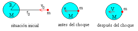 Choque de un meteorito con la Tierra inmóvilPrimero, vamos a resolver un problema sencillo que se plantea habitualmente en un curso de Física General: Supongamos la Tierra de masa M y radio R inmóvil en el espacio, un meteorito de masa m<<M se mueve en la dirección radial hacia el centro de la Tierra con velocidad v0 cuando está a una distancia r0>R. Determinar