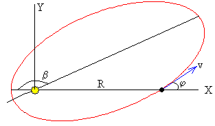 Como vemos en la figura, la trayectoria que sigue la partícula es una elipse, pero que está girada un ángulo β. Este ángulo se calcula poniendo r=R en la ecuación de la trayectoria y despejando el ángulo θ
