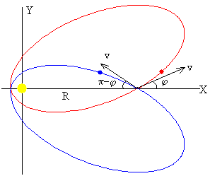 (m+M) J Con estos datos calculamos la excentricidad de la órbita ε y el parámetro d d=0.996·1011 m El semieje mayor de la elipse es a=1.19·1011 m y el periodo P=236.83 días Choque oblicuoCambiamos el ángulo a α=60º y planteamos las ecuaciones de conservación del momento lineal a lo largo del eje X y a lo largo del eje Y.