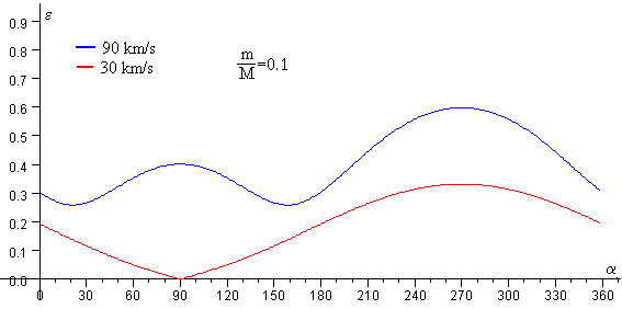 En la figura, se muestra el comportamiento complejo de la excentricidad ε en función del ángulo α que forma la dirección de la velocidad Vm del meteorito con el eje X para dos velocidades distintas del meteorito 30 km/s (en rojo) y 90 km/s (en azul). La excentricidad tiene un valor máximo para α=270º que es el choque frontal. Se observa un valor mínimo (curva de color rojo) para α=90º que es un choque en el que la Tierra y el meteorito tienen la misma dirección y sentido. Para velocidades grandes del meteorito, (curva azul) hay mínimos para ciertos ángulos cuyo valor se obtiene en el artículo citado en las referencias.