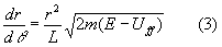 Las ecuaciones (1) y (2) de constancia del momento angular y de la energía constituyen un par de ecuaciones diferenciales en las que se puede eliminar el tiempo t, para obtener la ecuación de la trayectoria r=r(q) integrado la ecuación diferencial