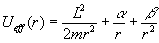Cuando actúa además una perturbaciónConsideremos ahora que sobre la partícula actúa además una perturbación inversamente proporcional al cubo de la distancia al centro de fuerzas. donde (b>0) se refiere a una perturbación repulsiva y (b<0) se refiere a una perturbación atractiva. El potencial efectivo se escribirá ahora Si L2+2mb>0 la representación del potencial efectivo es similar a de las figuras que hemos visto anteriormente. La ecuación de la trayectoria se obtiene integrando la ecuación diferencial (3), cuya solución es Los valores de los parámetros d, e y k son los siguientes