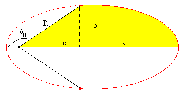 El área sombreada es el área de la porción de elipse comprendida entre x y a más el área del triángulo de base R·cos(π-θ0) y altura R·sen(π-θ0), siendo x=-c+R·cos(π-θ0) Sabiendo que la ecuación de la elipse es
