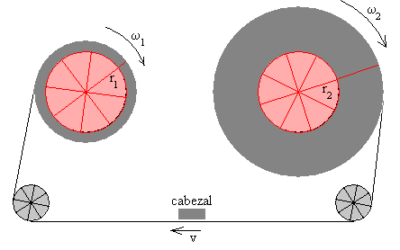 La cinta se desenrolla de la rueda derecha y se enrolla en la izquierda. En un instante determinado t, la relación entre la velocidad lineal constante v de la cinta y las velocidades angulares de rotación de las ruedas serán