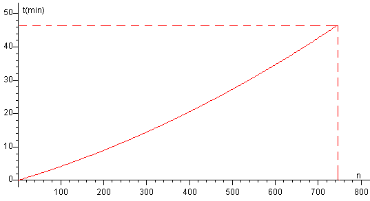 Supongamos que en el instante inicial t=0, el radiode la rueda izquierda es r0=1.11 cm, el radio de la rueda derecha es R0=2.46 cm, y la lectura del contador es n=0. Cuando la cinta está completamente enrollada en la rueda izquierda ha trascurrido un tiempo de T=46.4 minutos, la lectura del contador es N=744.
