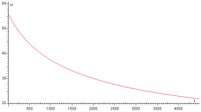 Obtenemos una solución aproximada de la integral, si nos damos cuenta que el primer término debajo de la raíz cuadrada h2/(4π2) es muy pequeño en comparación con el segundo. La longitud de la espiral de Arquímedes se puede obtener aún más rápidamente, calculando el radio medio Rm=(R0+Rf)/2=40.5 mm de las pistas y multiplicando la longitud de la pista media por el número N de pistas considerando que tienen el mismo radio Rm s=N·2πRm=5566.5 m Velocidad angular de rotaciónLa velocidad de lectura es constante, v=s/T Sin embargo, la velocidad angular de rotación cambia, la velocidad angular inicial es ω0=v/R0=56.0 rad/s y la velocidad angular final es ωf=v/Rf=22.2 rad/s La velocidad angular de rotación en función del ángulo θ es Integrando En el instante t=72·60=4320 s que se completa la lectura del CD Derivando con respecto del tiempo obtenemos la expresión de la velocidad angular ω en función del tiempo t. Donde ω0=v/R0 es la velocidad angular inicial, para t=0 En la figura, se muestra la variación de la velocidad angular ω con el tiempo t. |