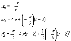 Tal como apreciamos en la tabla de las posiciones de los móviles A y B en función del tiempo, el móvil B pasa al móvil A entre los instantes 2.7 y 2.8. El momento en el que se produce el primer encuentro será un instante t a determinar en el intervalo de tiempo comprendido entre 2.7 y 2.8 s. La relación que existe entre las posiciones del móvil A y del móvil B, tal como vemos en la tabla es qA-2p =qB Despejando el tiempo t en la ecuación de segundo grado, obtenemos el instante del primer encuentro t=2.77 s. Introduciendo t en la ecuación de la posición de A y de B obtenemos la posición de los móviles en el instante del encuentro qA=5.56p rad