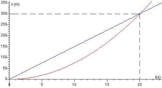 Encuentro de dos vehículos en movimiento rectilíneoUn automóvil que está parado, arranca con una aceleración de 1.5 m/s2. En ese mismo instante es adelantado por un camión que lleva una velocidad constante de 15 m/s. Calcular la posición de encuentro de ambos vehículos Escribimos las ecuaciones del movimiento de cada uno de los vehículos x1=15·t La posición de encuentro x1=x2 da lugar a la ecuación de segundo grado 0.75t2-15t=0 cuyas soluciones son t=0, y t=20. El instante de encuentro es te=20s, y la posición de encuentro xe=300 m medida desde la salida. Solución gráfica