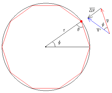 La aceleración media para infinitos impactosEl cambio total de velocidad que experimenta la partícula tras n impactos es Cuando n es muy grande (tiende a infinito) el ángulo f es muy pequeño y podemos sustituir el seno por el ángulo. De modo que, el cambio total de velocidad que experimenta la partícula es Cuando n es muy grande (tiende a infinito) el perímetro del polígono regular (trayectoria) que describe la partícula se aproxima a una circunferencia de radio r. Como el módulo de la velocidad de la partícula v no cambia en los impactos con la pared rígida, el tiempo P que tarda en describir la circunferencia es El módulo de la aceleración media es Dada la simetría de la trayectoria circular, la aceleración media es la aceleración de la partícula en cada instante