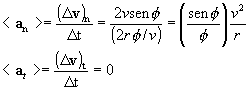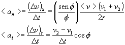 Al no ser los vectores velocidad de igual módulo, el vector diferencia Dv y por tanto la aceleración no tienen en general, dirección radial. La partícula recorre el arco AB de ángulo 2f empleando un tiempo Dt=Dt1+ Dt2. La velocidad media <v> de la partícula en este intervalo de tiempo es La componente normal y tangencial de la aceleración serán por tanto, En el límite cuando el intervalo de tiempo Dt® 0, o bien cuando f ® 0, se cumple que, senf / f ® 1, cosf ® 1. La velocidad media <v>® v es la velocidad en el instante t cuando el móvil pasa por P, y también la velocidad promedio (v1+v2)/2® v. De este modo obtenemos la misma fórmula de la componente normal de la aceleración que en el apartado anterior. En cuanto a la componente tangencial, el numerador es un cambio infinitesimal en el módulo de la velocidad dv y el denominador es el tiempo dt que tarda la partícula en efectuar dicho cambio. Las componentes de la aceleración serán, por tanto,