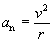 Deducción alternativa de la aceleración normal (II)En esta sección, se describe la deducción más simple que se ha encontrado de la fórmula de la aceleración normal en un movimiento circular uniforme El vector velocidad v se define Su módulo para un movimiento circular uniforme es Siendo P el periodo o tiempo que tarda en completar una vuelta Su dirección es tangente a la trayectoria, es decir, perpendicular al vector r El vector aceleración a se define El vector aceleración a se obtiene a partir del vector velocidad v, de la misma manera que el vector velocidad v se obtiene a partir del vector posición r. Su módulo será, análogamente, Su dirección es tangente a la circunferencia de radio v, es decir perpendicular al vector v. Como vemos en la figura, los vectores a y r tienen la misma dirección pero sentidos contrarios.