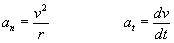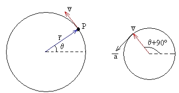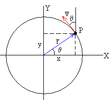 Deducción alternativa de las fórmulas de la aceleración tangencial y normalEn la figura, la partícula se encuentra en el instante t en el punto P, formando un ángulo q con el eje X. El vector posición r de la partícula es r=xi+yj=r·cosq i+r·senq j El vector velocidad v se obtiene derivando el vector posición respecto del tiempo El vector aceleración se obtiene derivando el vector velocidad El vector aceleración tiene dos componentes, que podemos expresar en virtud de las relaciones entre magnitudes angulares y lineales de dos formas. La componente radial está dirigida hacia le centro de la circunferencia an=w2r=v2/r, La componente tangencial tiene la dirección de la velocidad, tangente a la trayectoria at=a r=dv/dt.