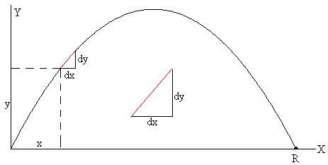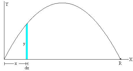 Área encerrada por la trayectoria y el eje horizontal XEn la figura se muestra el área diferencial y·dx. El área total encerrada entre la trayectoria y el eje X se calcula mediante la integral definida.