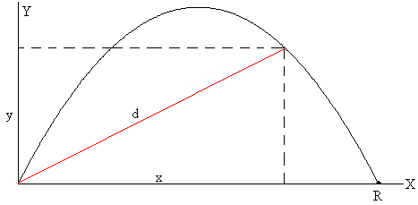 Para ángulos de tiro θ< θ0 la distancia d entre el origen y el proyectil es una función creciente del tiempo, que alcanza su máximo valor cuando impacta en el suelo. El máximo d es igual al alcance R y ocurre en el instante T=2v0senθ/g que es el tiempo de vuelo. En el instante t+ la distancia d+ entre el origen y la posición del proyectil vale