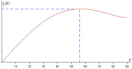 La representación gráfica nos indica que el máximo de L(θ) se encuentra entre 50 y 60º Al final de esta página, se proporciona el código en Lenguaje Java del procedimiento que permite calcular la raíz de la ecuación trascendente por el procedimiento del punto medio. El valor que se obtiene es θm=56.46º