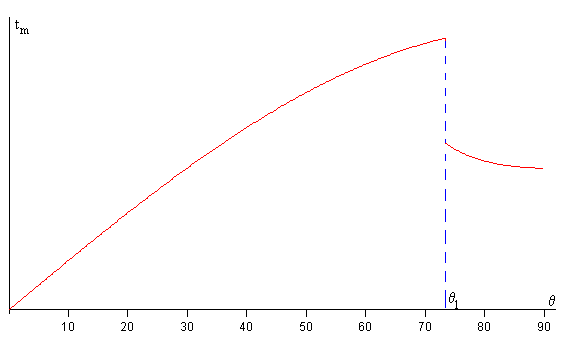 De las dos soluciones de la ecuación de segundo grado t+ y t- solamente hemos de tener en cuenta la segunda, ya que d->d+ para θ>θ0=70.5º . Verificamos que el instante t- es menor que el tiempo de vuelo T