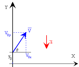 Las ecuaciones del movimiento de un proyectil bajo la aceleración constante de la gravedad son: Eliminado el tiempo en las ecuaciones que nos dan las posiciones x e y, obtenemos la ecuación de la trayectoria, que tiene la forma y=ax2 +bx +c, lo que representa una parábola. Obtenemos la altura máxima, cuando la componente vertical de la velocidad vy es cero; el alcance horizontal x cuando el cuerpo retorna al suelo y=0.