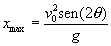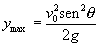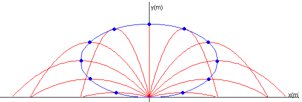 Para que las raíces sean iguales, se tiene que cumplir que el discriminante b2-4ac de la ecuación de segundo grado ax2+bx+c=0 sea nulo. Esta es la ecuación de la envolvente que hemos obtenido anteriormente. La elipse que une las posiciones de altura máximaLa altura máxima se alcanza cuando vy=0, en el intante t=v0·senθ/g. La posición (xh, yh) del proyectil en este instante es Teniendo en cuenta, la relación trigonométrica 1-cos(2θ)=2sen2θ Despejando sen(2θ) en la primera ecuación, cos(2θ), en la segunda, elevando al cuadrado y sumando, eliminamos el ángulo 2θ. Esta ecuación representa una elipse centrada en el punto (0, b) cuyos semiejes son 2b y b