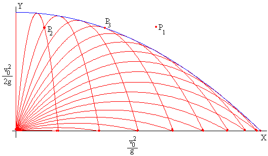 Alcance horizontal y altura máximaEn el applet se trazan las trayectorias de proyectiles disparados con la misma velocidad inicial v0 pero con los siguientes ángulos de tiro q : 10º, 20º, 30º, 40º, 45º, 50º, 60º, 70º, 80º, 90º. Las ecuaciones del movimiento de los proyectiles son x=v0·cosq ·t La parábola de seguridadEl alcance horizontal de cada uno de los proyectiles se obtiene para y=0. Su valor máximo se obtiene para q =45º, teniendo el mismo valor para q =45+a , que para q =45-a . Por ejemplo, tienen el mismo alcance los proyectiles disparados con ángulos de tiro de 40º y 60º, ya que sen(2·40)=sen(2·60). La altura máxima que alcanza un proyectil se obtiene con vy=0. Su valor máximo se obtiene para el ángulo de disparo q =90º. La envolvente de todas las trayectorias descritas por los proyectiles cuyo ángulo de disparo está comprendido entre 0 y 180º se denomina parábola de seguridad. Esta denominación hace referencia al hecho de que fuera de esta parábola estamos a salvo de los proyectiles disparados con velocidad v0. Se trata de la parábola simétrica respecto del eje Y de ecuación y=-ax2+b que pasa por los puntos (x=v02/g, y=0), y (x=0, y=v02/(2g)) tal como se ve en la figura. La ecuación de dicha parábola es Deducción alternativa de la ecuación de la parábola de seguridad Las ecuaciones paramétricas de la trayectoria son x=v0·cosθ·t Eliminado el tiempo t, obtenemos la ecuación de la trayectoria Esta ecuación se puede escribir de forma alternativa Consideremos un punto arbitrario P del plano. Sustituimos las coordenadas (x, y) del punto en la ecuación de la trayectoria y puede ocurrir