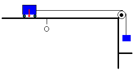 Aceleramos el carrito, mediante una cuerda que pasa por una polea situada en el extremo derecho de la regla. Una pesa que se cambiar pulsando el botón titulado Nuevo, cuelga de la cuerda.