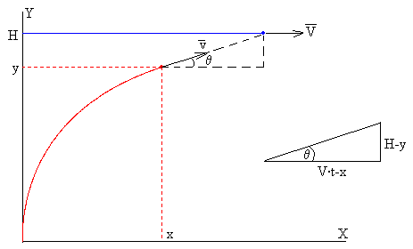 Ecuación del movimiento del torpedoEn el triángulo rectángulo de la figura, la base es la diferencia entre el desplazamiento del submarino V·t y la del torpedo x. La altura es la diferencia H-y. Como la dirección de la velocidad del torpedo es la línea recta que pasa por la posición del torpedo y la del submarino en el instante t, tendremos que